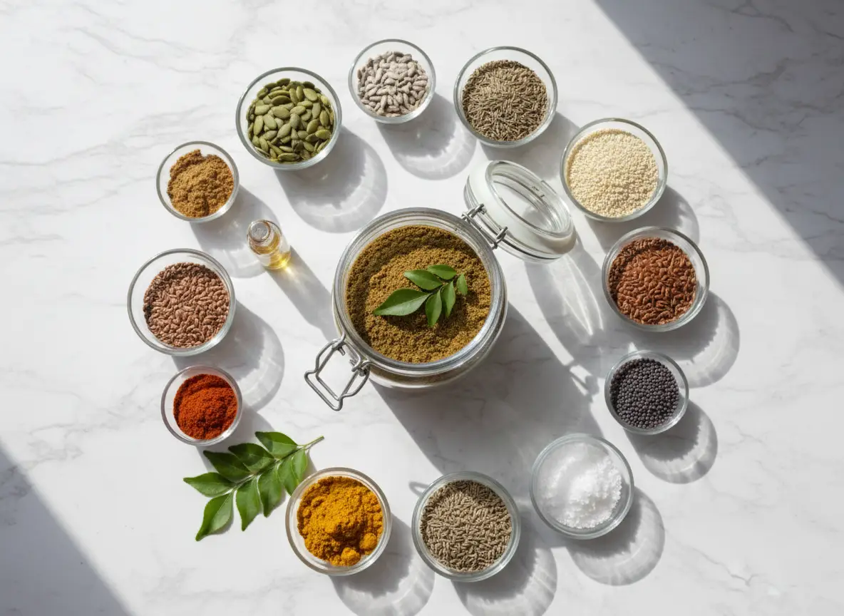 Roasted flax seeds, pumpkin seeds, blackgram,