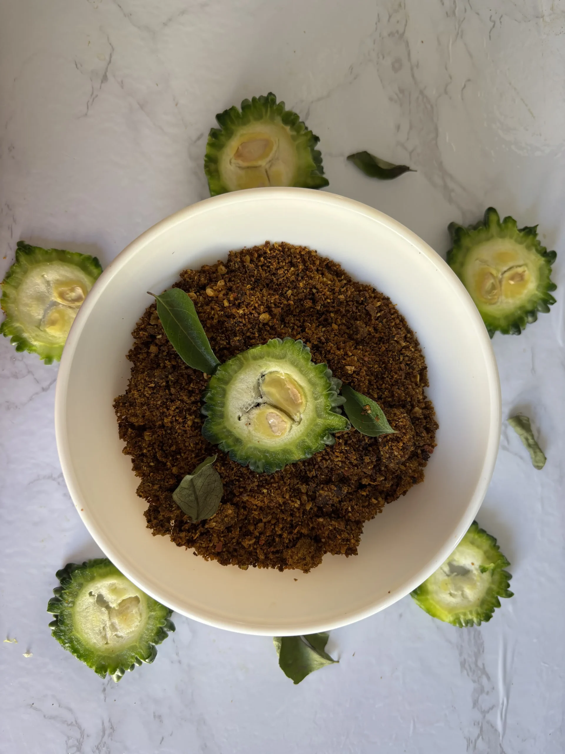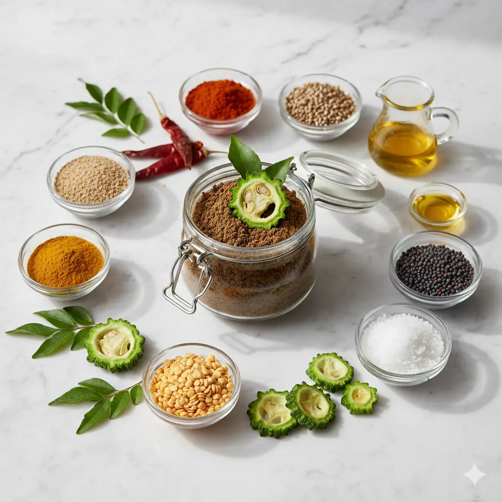 Roasted raw bitter gourds, blackgram, bengal gram,
