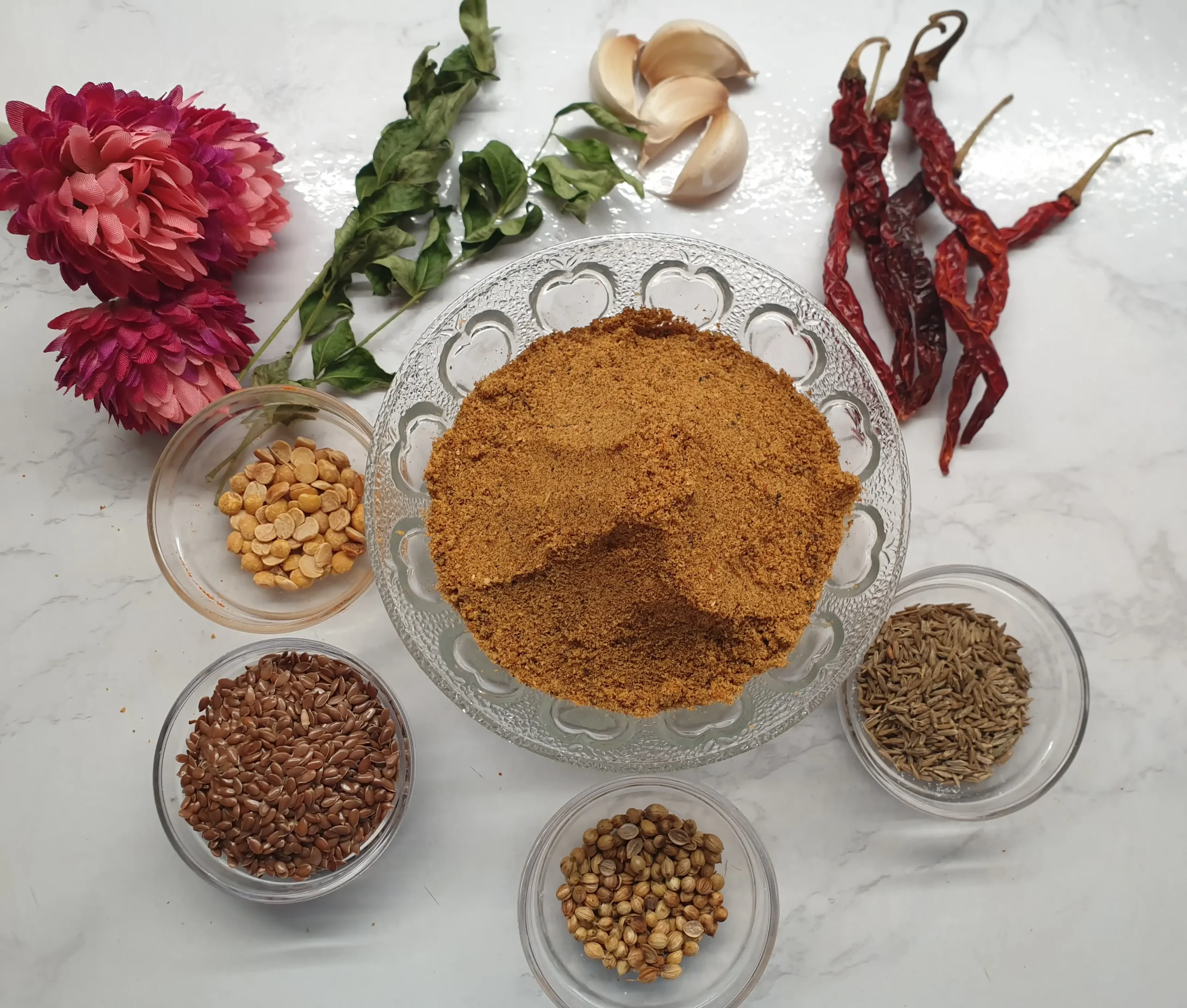 Roasted flax seeds, blackgram, bengal gram,