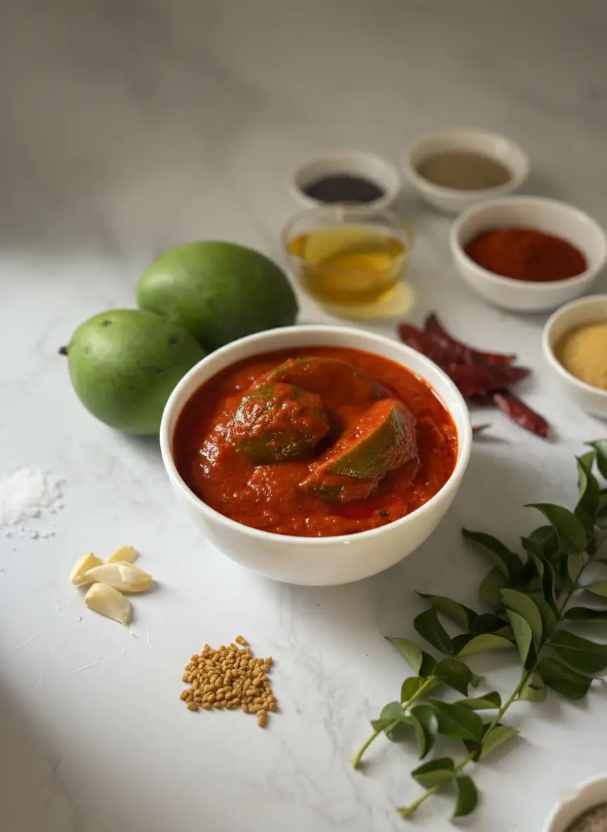 Raw, unripe green Mangoes, mustard seeds, cumin seeds,