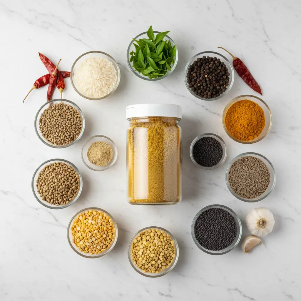 Black gram, toor dal, fenugreek seeds, cumin seeds,